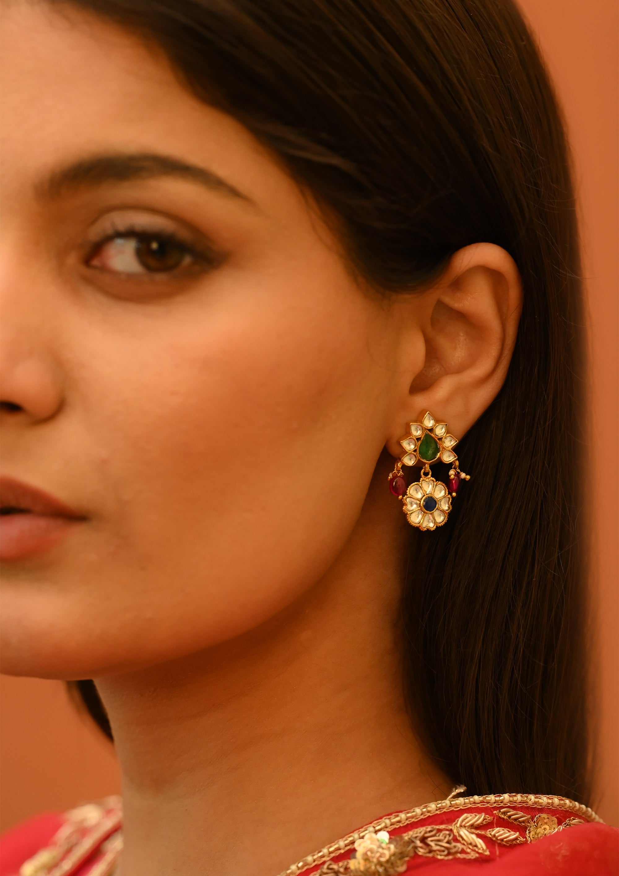 The Saavan Bracelet is a handcrafted treasure in alloy with 24k gold plating, featuring Belur Polki, tourmaline, Green Onyx, Blue Iolite and Swarovski pearls.A vibrant peacock centerpiece with green meenakari teardrops adds a touch of regal charm, finished with a secure link lock. Ideal for festive gatherings, mehendi functions, or joyful family celebrations.
