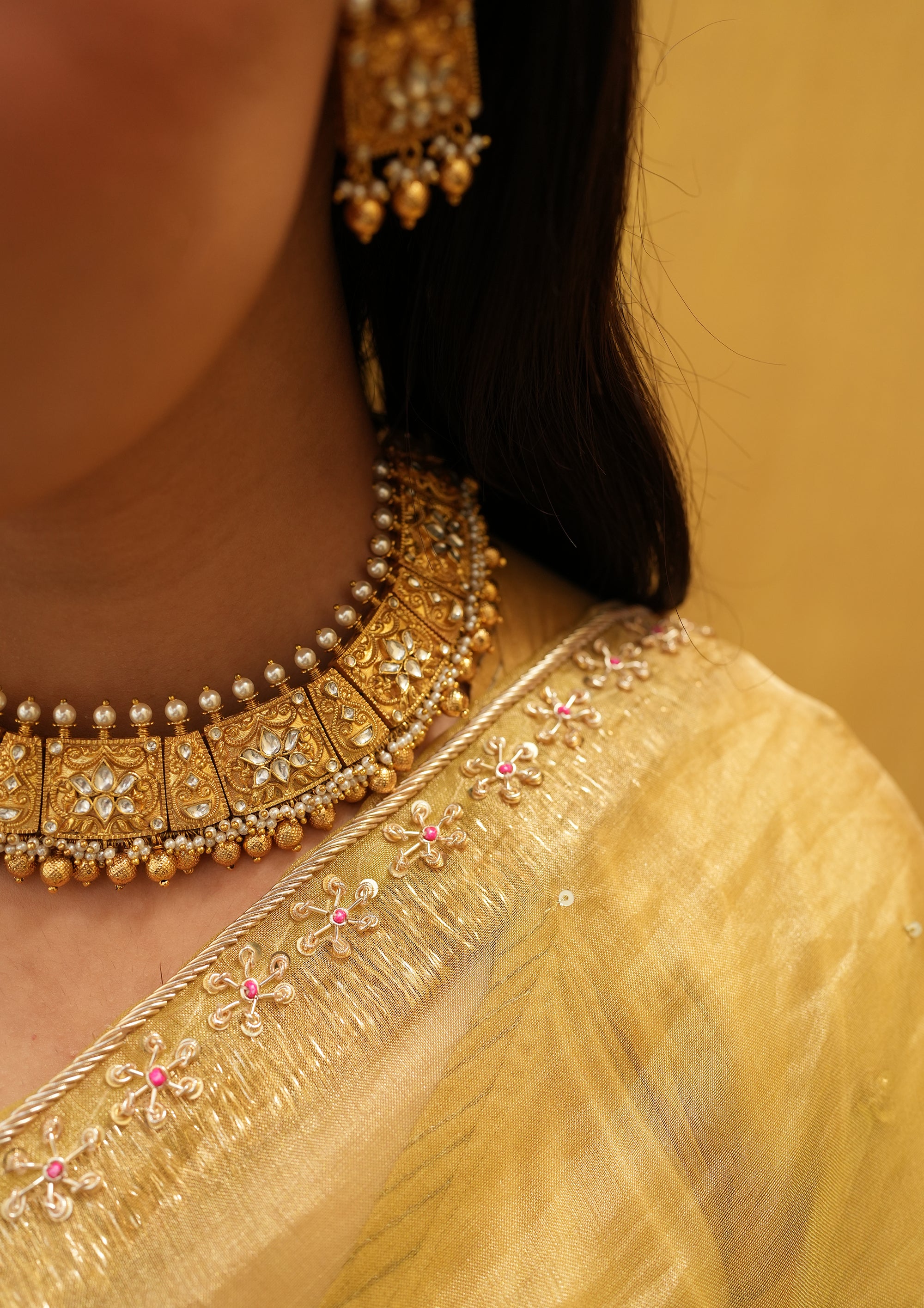 The Sterling Silver Chitrakala Bela Bracelet, plated in 24K gold, features Moissanite Polki, ruby, and blue and green meenakari, with a creative criss-cross leaf design inspired by nature. Its intricate detailing and box lock offer both elegance and security. Perfect for weddings, festive celebrations, and cultural events, best paired with Izra Sterling Silver Semi-Moissanite Blue and Green Meenakari Shield Studs for a coordinated, nature-inspired look.