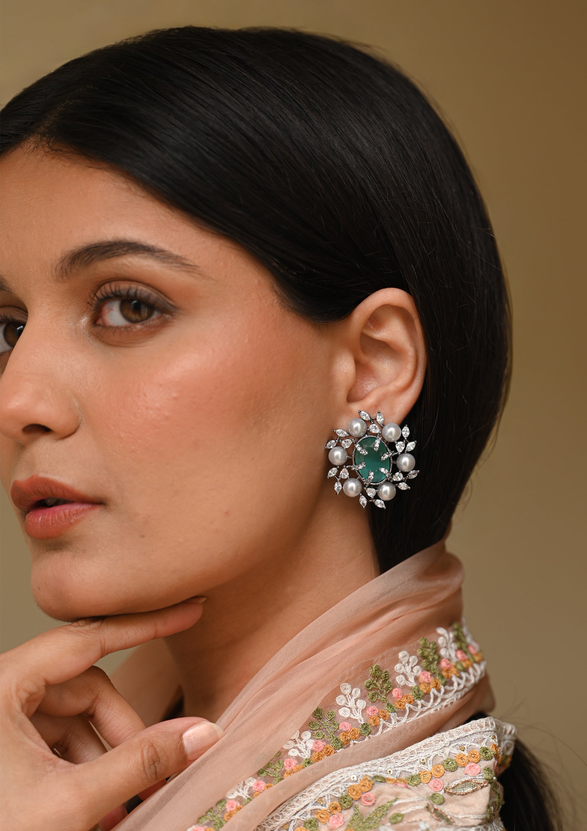 Amber Earrings are exquisitely handcrafted in alloy with a lustrous rhodium polish, offering a refined and elegant finish. Adorned with AAA Grade Cubic Zirconia and radiant yellow aventurine, they bring a warm, sophisticated sparkle. Secured with a push-back lock, these earrings are perfect for festive celebrations, Haldi/Mehendi, and elegant evening occasions.