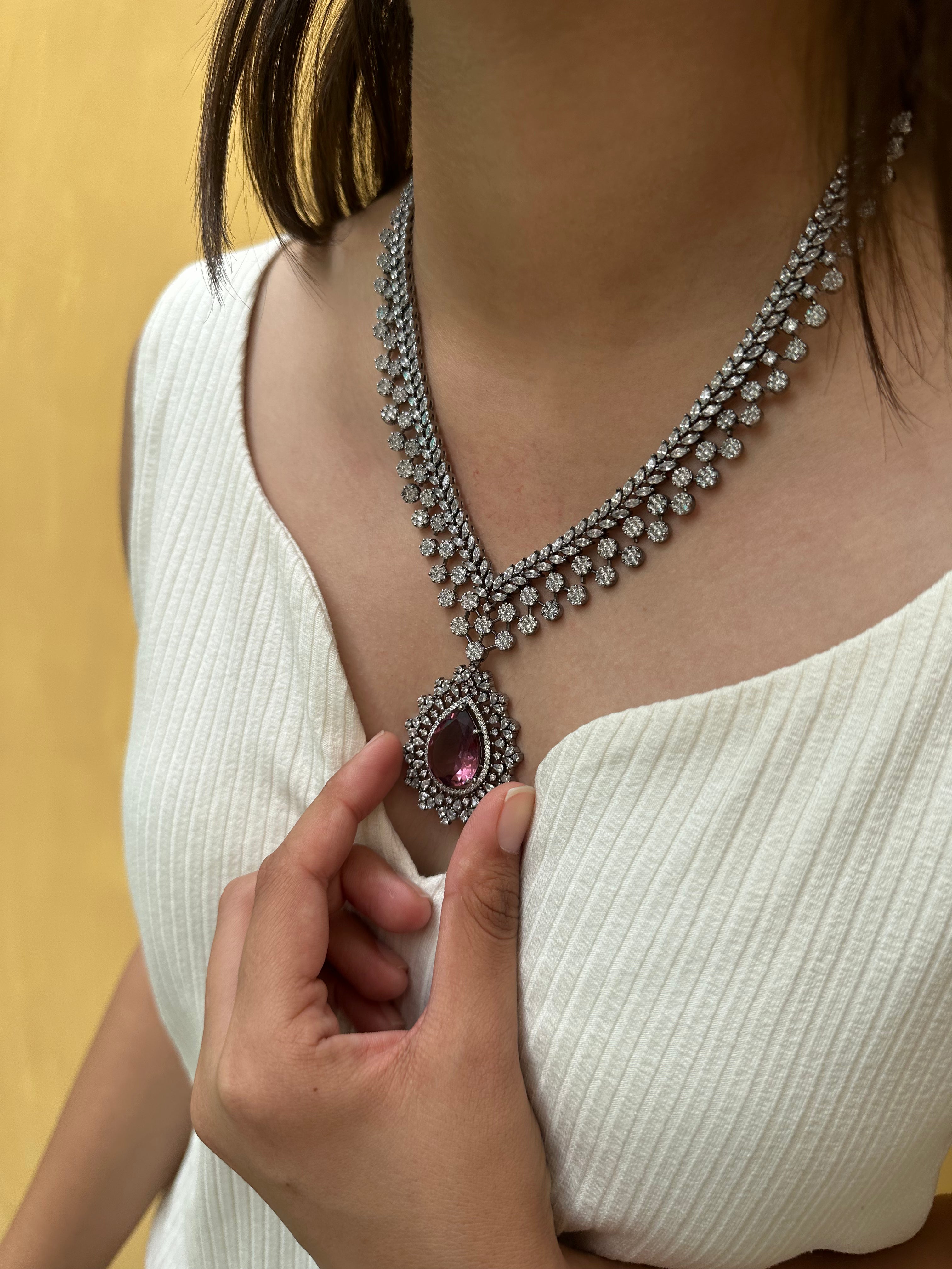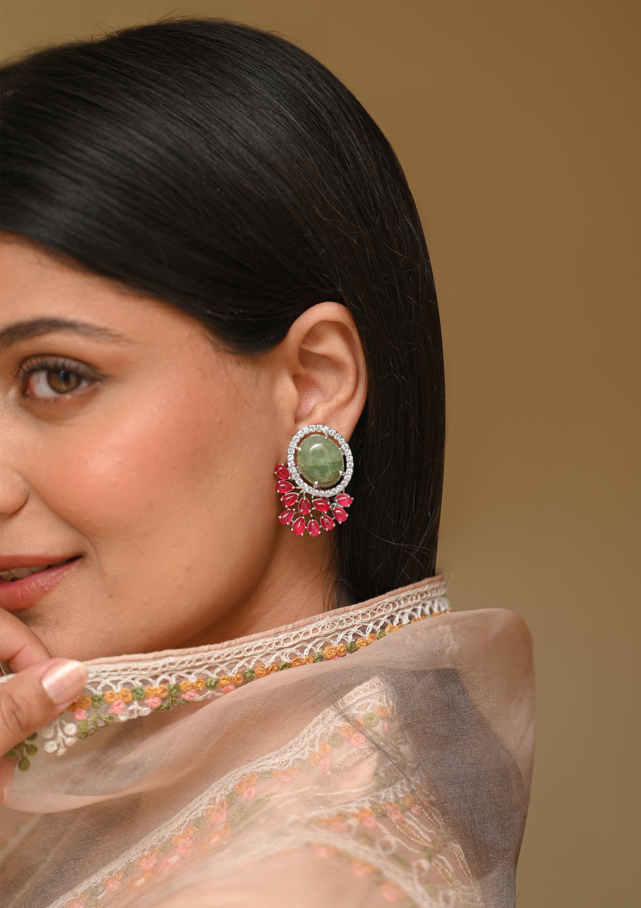 Primrose Earrings are exquisitely handcrafted in alloy with a luxurious rhodium polish, offering a refined and contemporary finish. Adorned with AAA Grade Cubic Zirconia, light green aventurine, and red quartz, they create a striking balance of elegance and color. Finished with a secure push-back lock, these earrings are ideal for festive celebrations, Haldi/Mehendi, cocktail evenings, and special occasions.