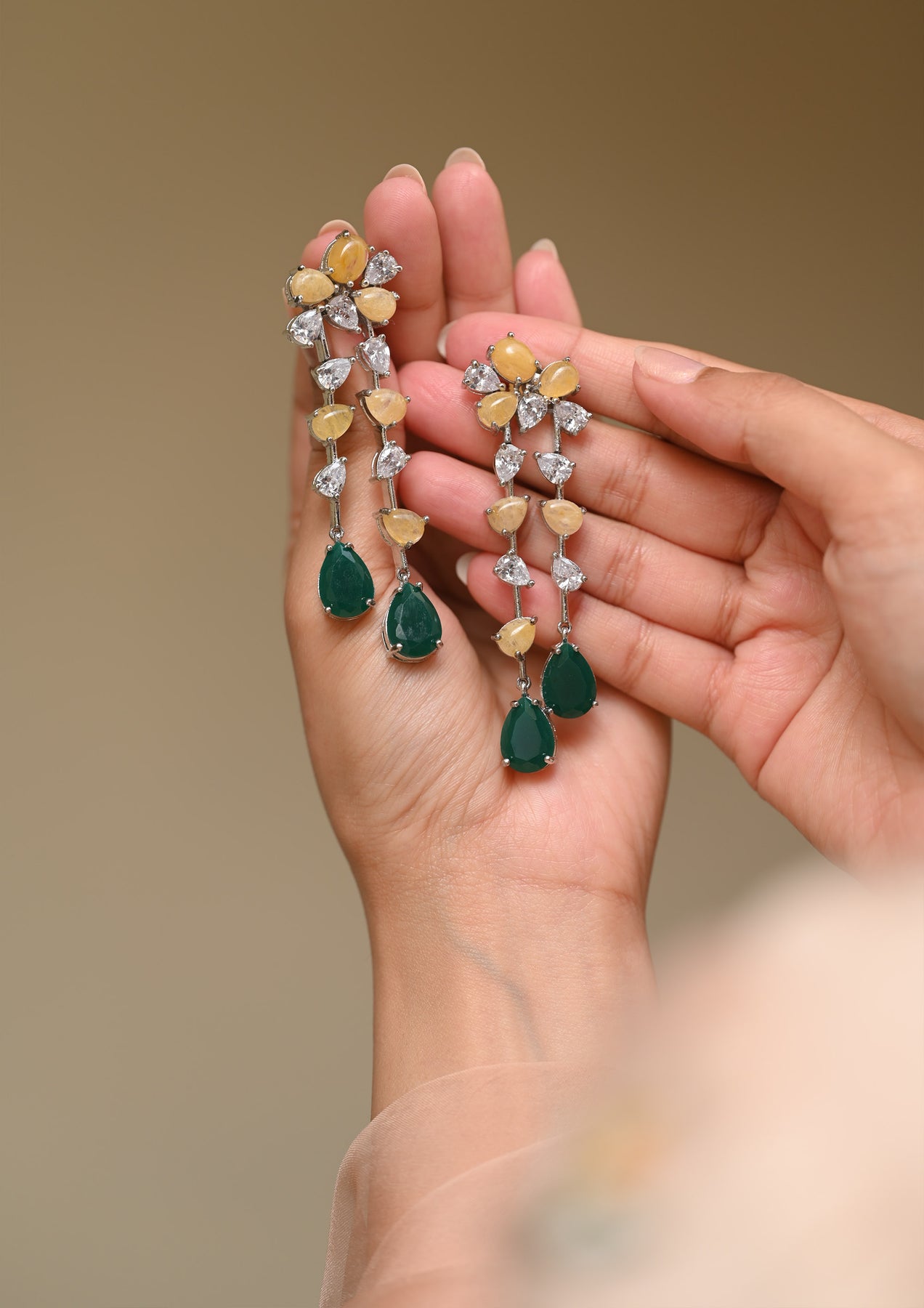 Sicily Earrings are beautifully handcrafted in alloy with a polished rhodium finish, offering a refined and elegant look. Adorned with AAA Grade Cubic Zirconia, yellow aventurine, and vibrant green lab stone, they add a lively touch of sparkle and color. Secured with a push-back lock, these earrings are perfect for Haldi/Mehendi, festive celebrations, and traditional occasions.