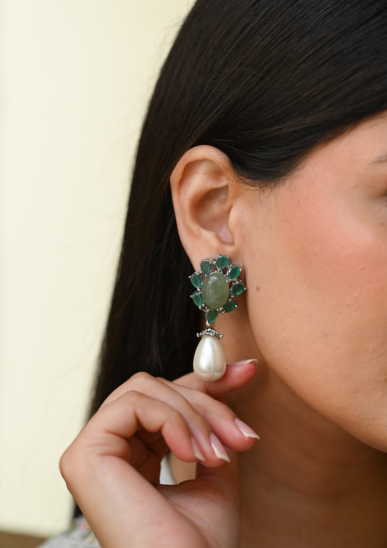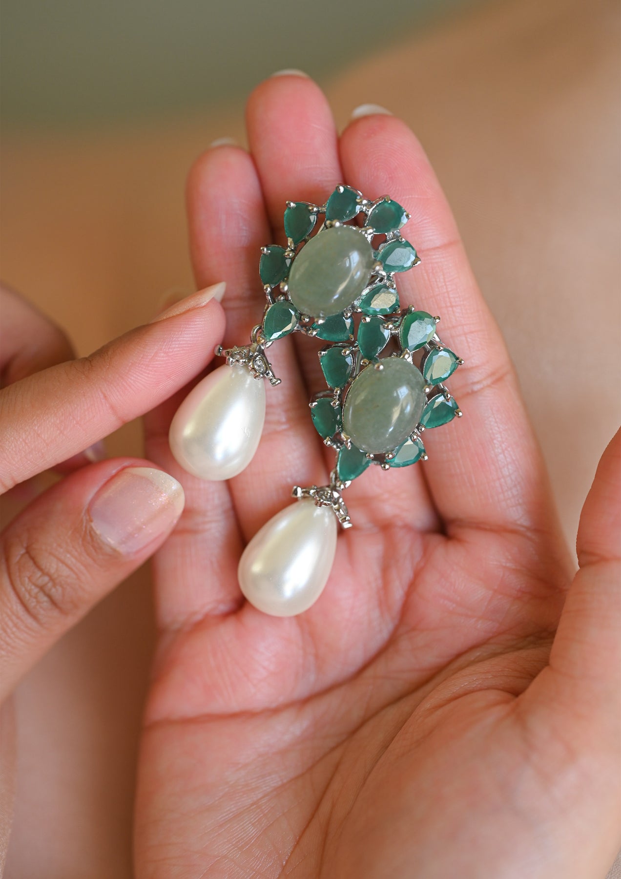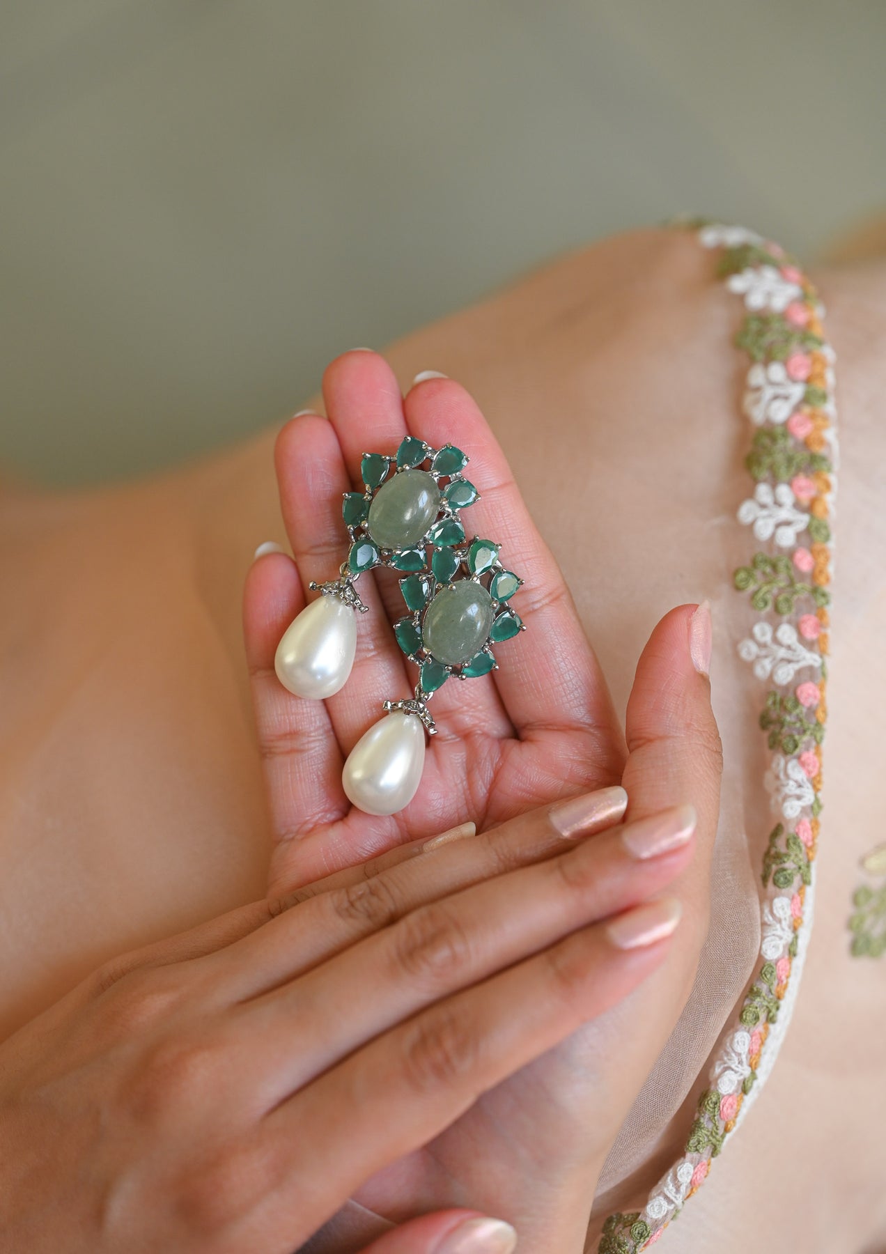 Willow Earrings are beautifully handcrafted in alloy with a smooth rhodium polish, creating a refined and elegant silhouette. Adorned with AAA Grade Cubic Zirconia and soft light green aventurine, they add a delicate touch of sparkle and color. Secured with a push-back lock, these earrings are perfect for festive occasions, Haldi/Mehendi, and graceful evening wear.